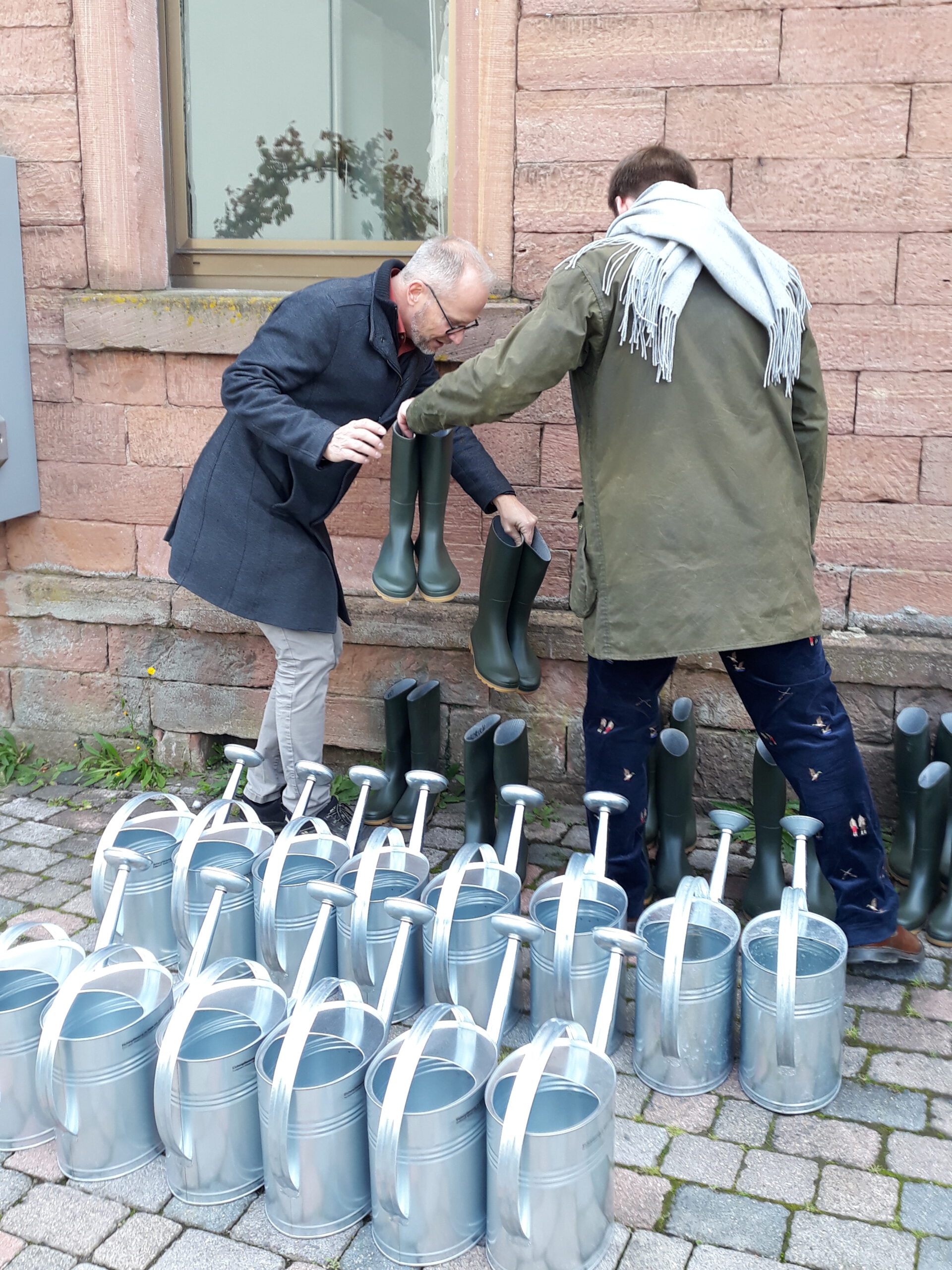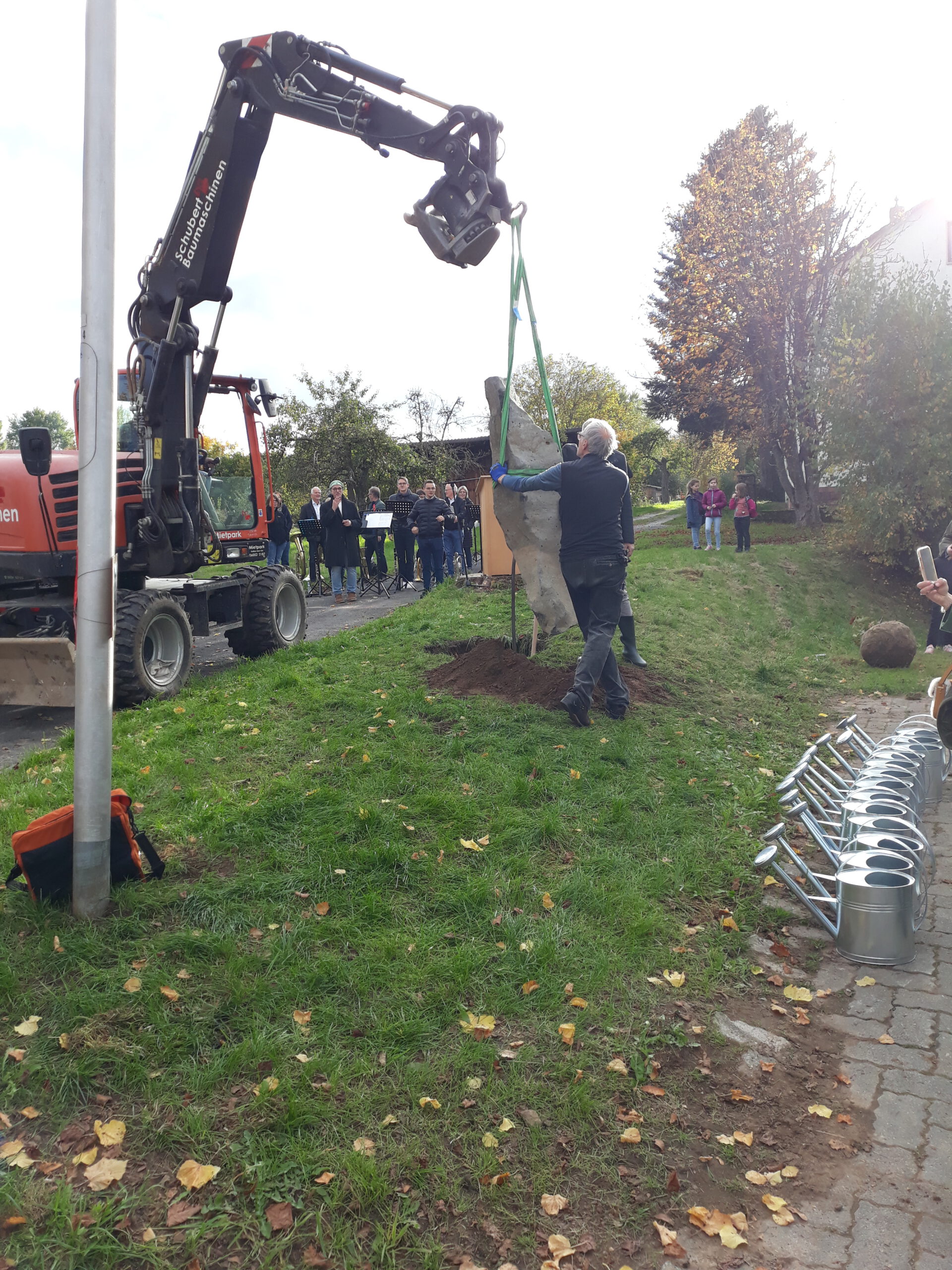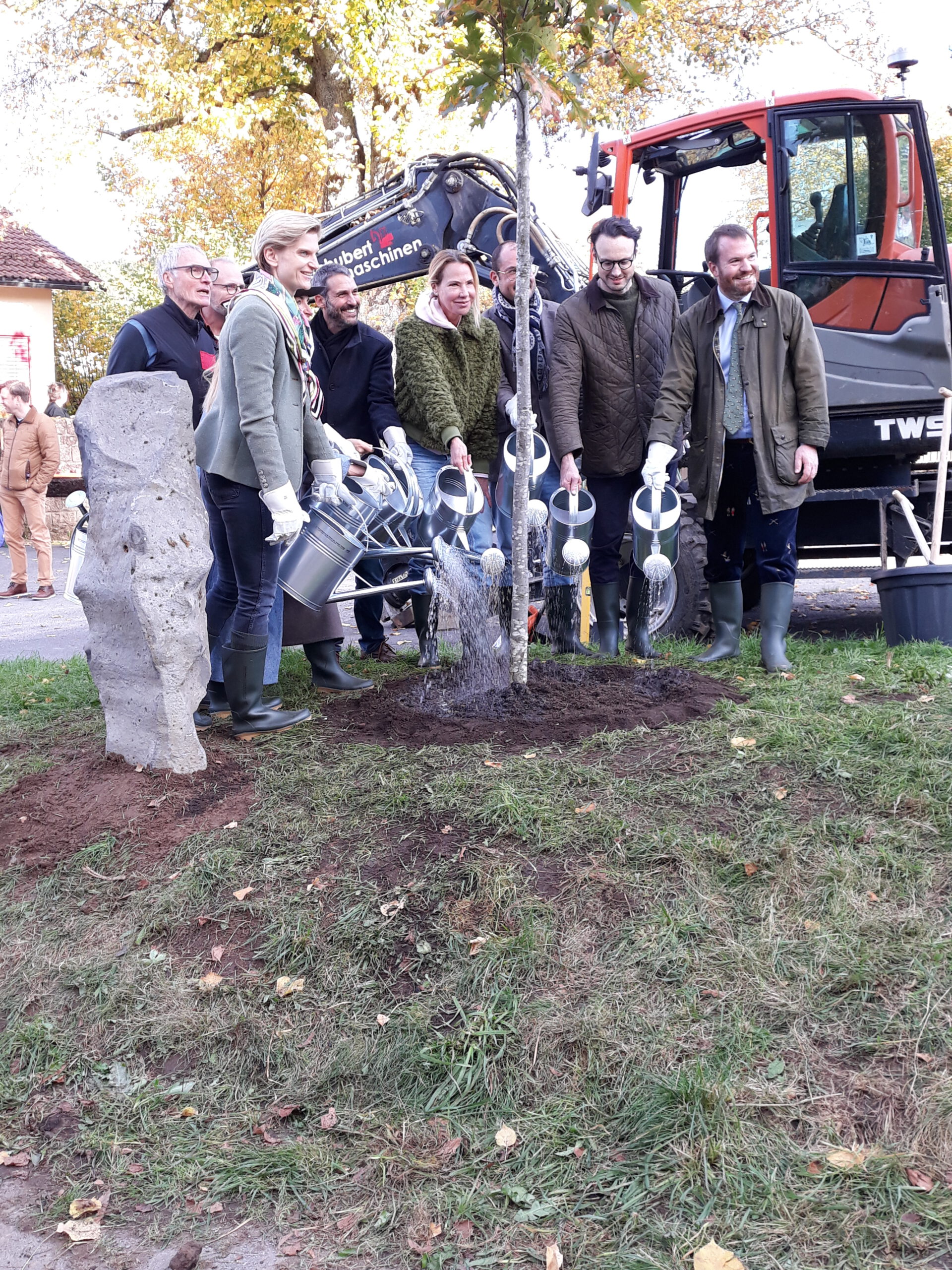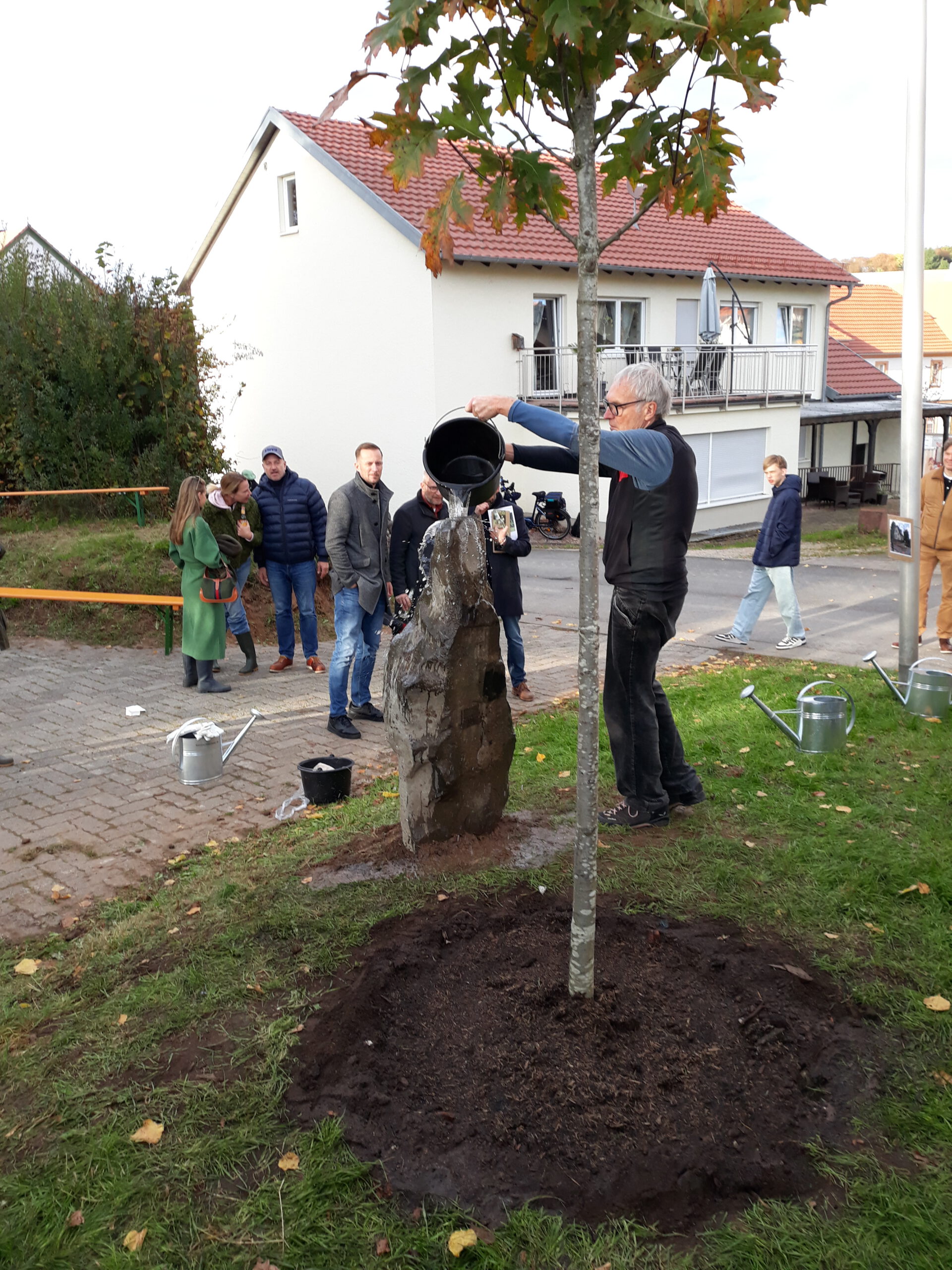 This planting took place as part of the closing weekend of the “Verschoben” exhibition organized by the Kunstverein Wiesen. It was accompanied by a guided tour of the exhibition—as well as an introductory walking performance by all participants to fill the watering cans for later watering of the newly planted oak tree.